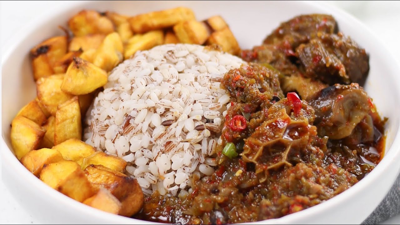 Distinctive, aromatic Ofada rice paired with spicy, flavorful pepper sauce and a mix of tender, seasoned meats and boiled egg. A vibrant, authentic taste of Nigeria in every bite.